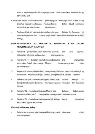 Perlembagaan Malaysia mengandungi 183 perkara. Semua undang-undang tidak boleh bercanggah dengan perlembagaan. Keluhuran Perlembagaan Malaysia terletak pada kedudukannya sebagai undang-undang tertinggi yang.